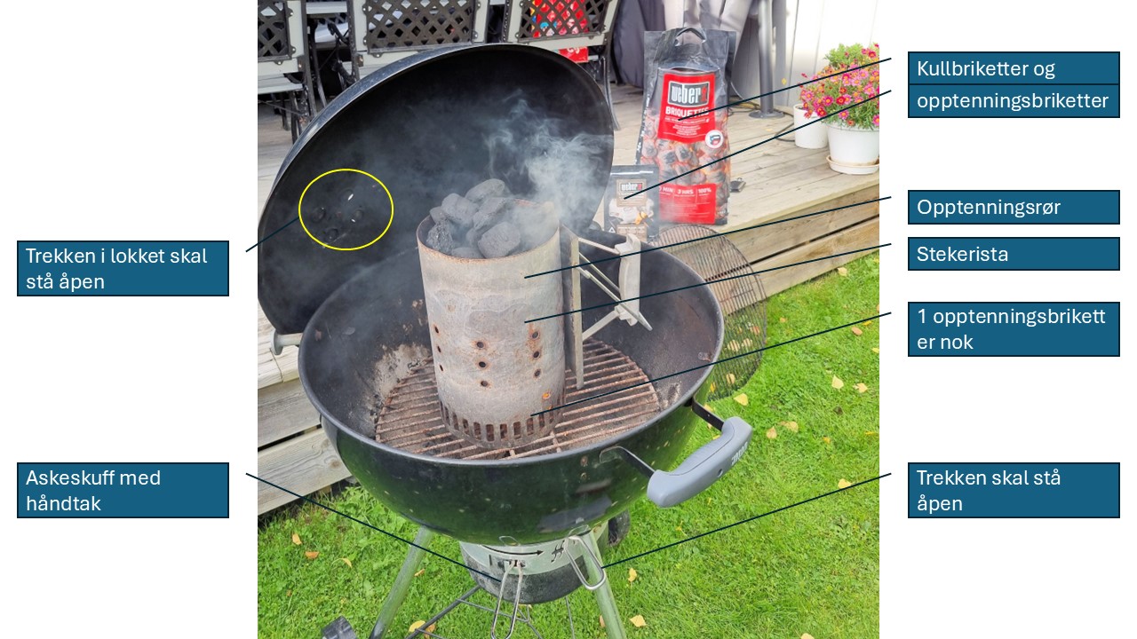 Legg én opptenningsbrikett eller vanlig peisbrikett midt på rista i bunnen av grillen. Tenn på og sett opptenningsrøret oppå. Sjekk etter et par minutter at kullet har tatt fyr.
